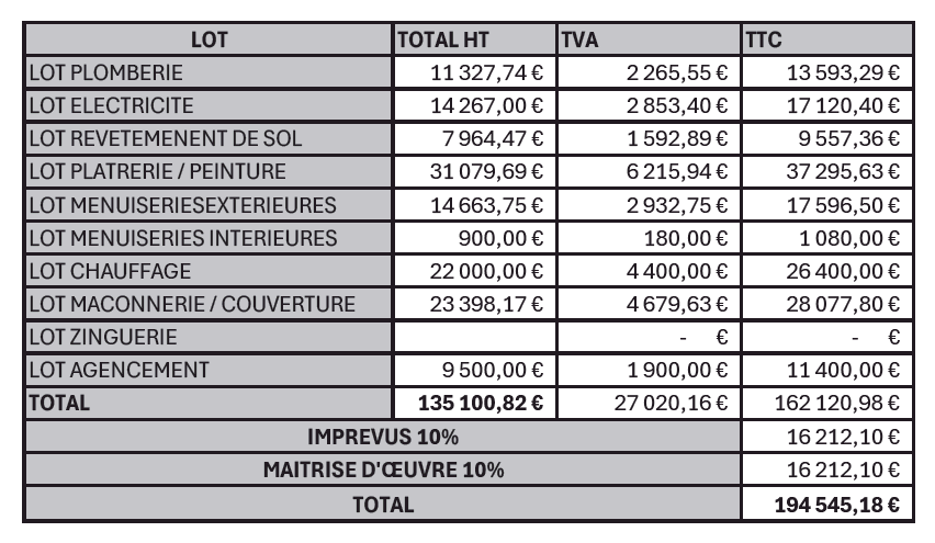 1) Réalisation de plans précis et de visuels 3D photoréalistes, 2) Chiffrage détaillé des travaux réalisables dans le bien, 3) Dossier complet permettant à l’acquéreur de se projeter immédiatement et d’avoir son enveloppe financière réelle.