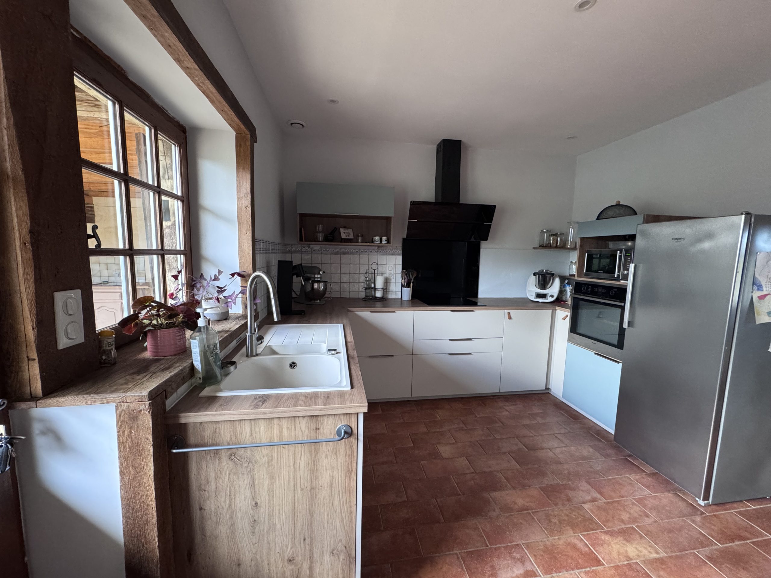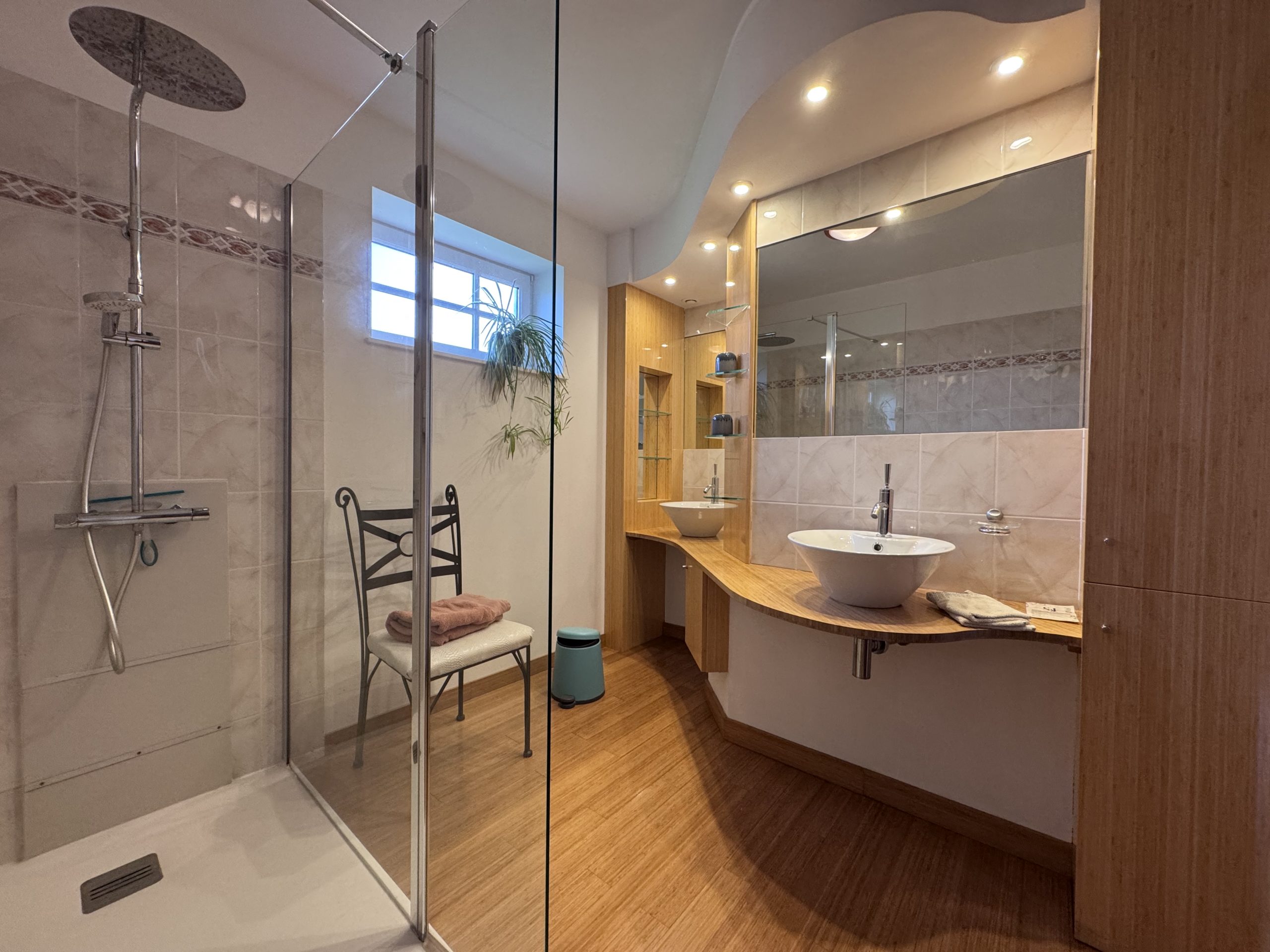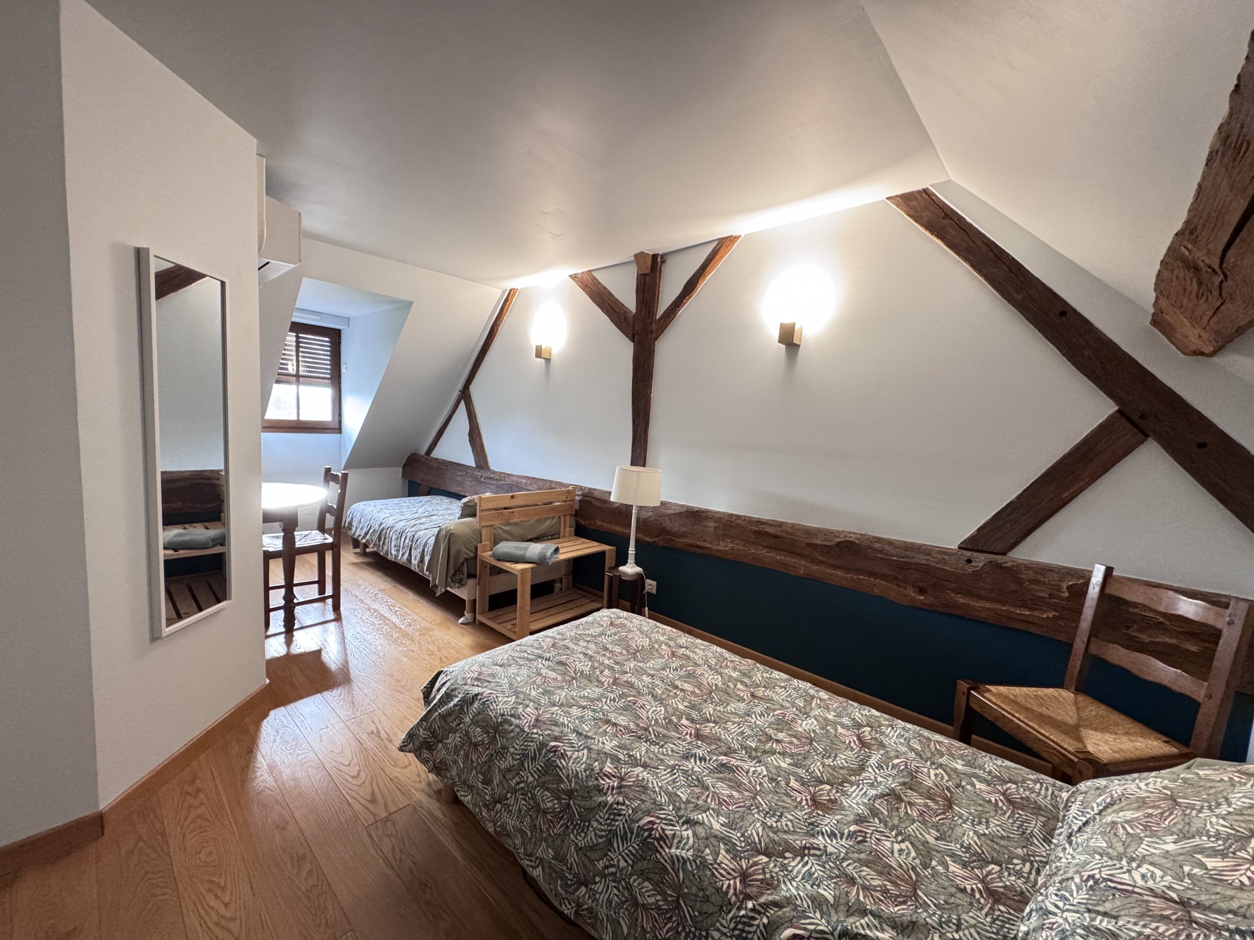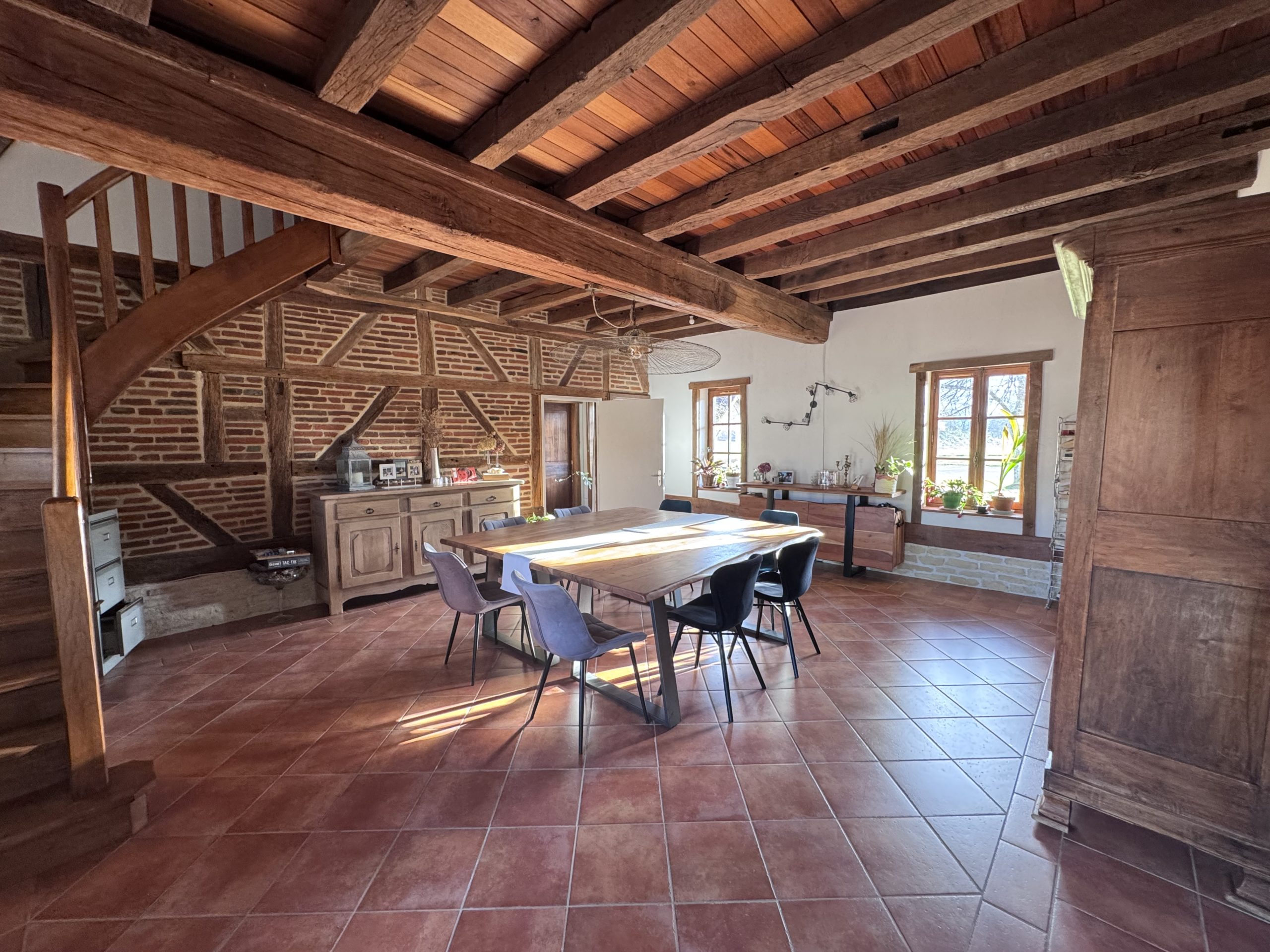 La maison se compose, au rez-de-chaussée, d’une entrée spacieuse, d’un séjour convivial, d’une cuisine récemment rénovée, d’une arrière-cuisine ou buanderie, d’une douche avec WC, d’un local technique et d’une chambre froide. On trouve également, au rez-de-chaussée, une partie dédiée aux chambres d’hôtes, comprenant une chambre, un WC et une salle de bain. À l’étage, côté droit, on découvre deux chambres, une salle de bain et un WC, utilisés pour l’accueil des hôtes. Côté gauche, on trouve une mezzanine, deux chambres supplémentaires, une salle de bain et un WC.